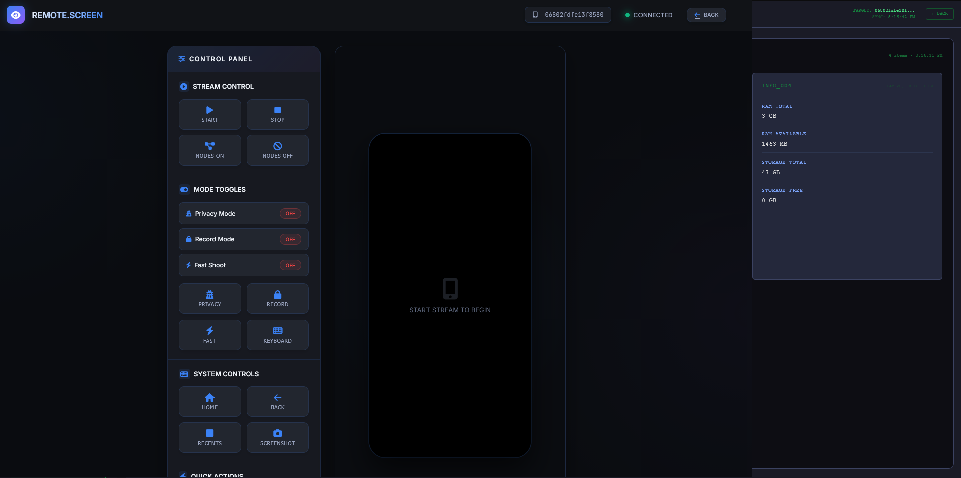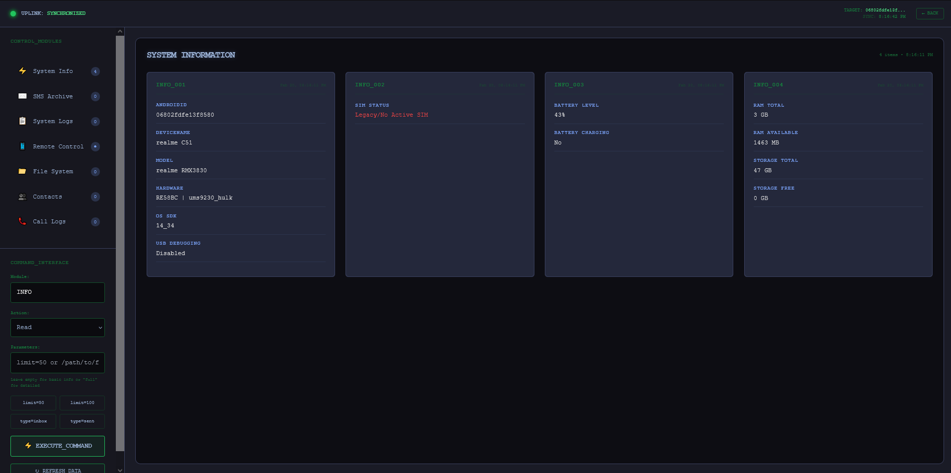 Retrieve detailed hardware specs, battery status, network info, and installed applications instantly.